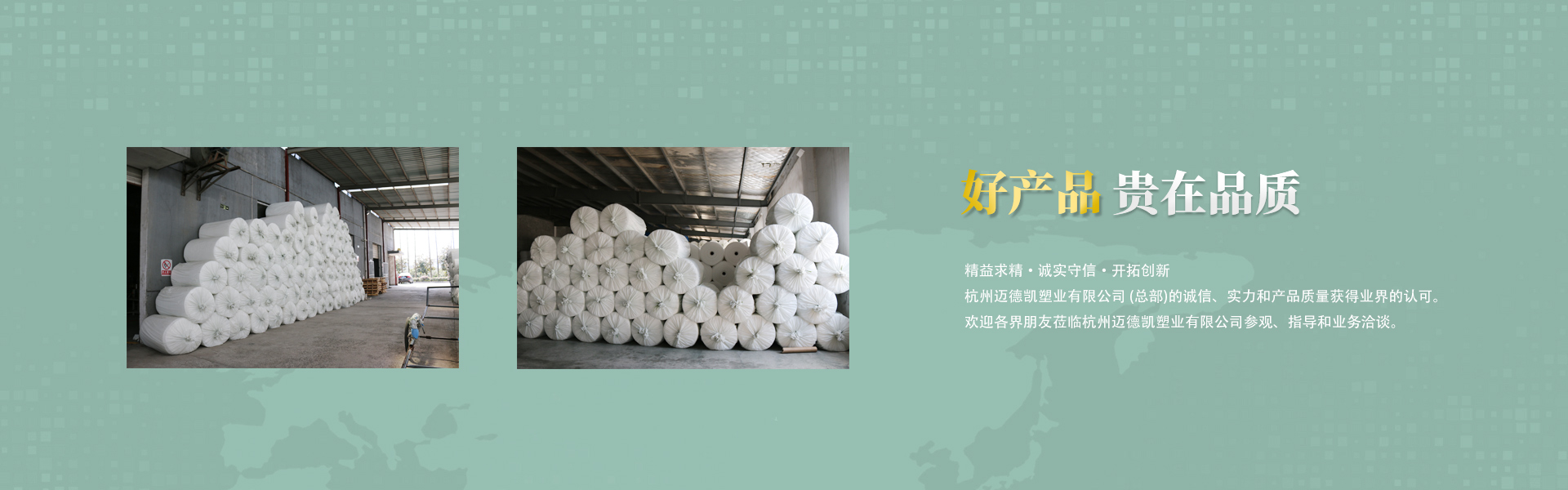 杭州迈德凯塑业有限公司 (总部)2010年9月成立于杭州,公司是EPE珍珠棉、编织布铝膜、无纺布铝膜、珍珠棉复合铝膜、珍珠棉管材、珍珠棉棒材、气垫泡、珍珠棉地板膜、彩钢瓦隔热膜、婴儿爬爬垫、沙滩垫、箱包衬垫等产品专业生产加工的私营有限责任公司。